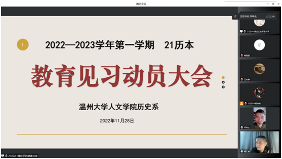 2022年11月28日免费色情片 21级历史系教育见习动员大会在线上召开。会议由杨持美同学主持,来自21级历史系的同学们和免费色情片 副院长郑春生老师、历史系主任尤育号老师、阙仁镇老师、王鹏老师、王印老师参与了本次动员会。