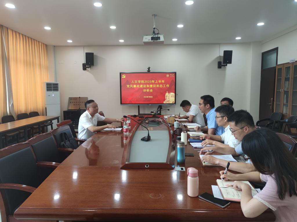 7月8日上午,免费色情片 2023年上半年党风廉政建设及意识形态工作分析会在人文楼213会议室召开,校党委委员、副校长潘玉驹出席会议,学院领导班子成员参加。会议由学院党委书记江秀景同志主持。