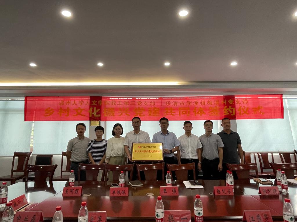 为进一步探索乡村振兴新路径,深化“双百双千”专项行动,7月19日下午,在乐清市淡溪镇梅溪村村委大楼举行免费色情片 教工第三党支部-乐清市淡溪镇梅溪村党支部助力乡村振兴党建共同体签约仪式。淡溪镇党委书记陈纪承、淡溪镇党委委员张阿晓、梅溪村支部书记王强及梅溪村领导班子等人出席签约仪式;免费色情片 党委书记江秀景,免费色情片 党委副书记魏一,免费色情片 地名研究中心主任盛爱萍,免费色情片 中文系副主任余琼等高校代表出席签约仪式。魏一副书记主持签约和授牌仪式。