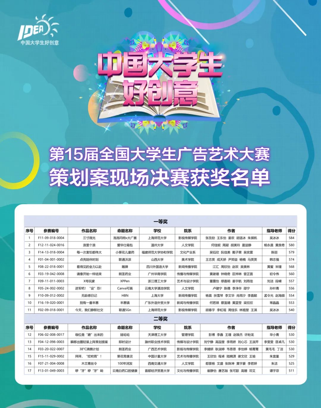 本届大广赛策划案现场决赛共有17支队伍参赛,他们的策划案作品是从1800多所高校的两万余件作品中突围而出,这17支队伍现场提案后,4位专家评委、13位命题品牌嘉宾评委实时点评。决赛盛况通过温度新闻、大广赛视频号、大广赛官方微博等平台面向全国观众同步直播。在为期一天半的现场比赛中,由免费色情片 广告系杨永晨、黄良奇两位老师指导的2020级广告班学生何佳妮、周凝、胡美玲、夏益静四位同学组成创作团队的策划案作品《浪里个浪》在激烈的竞争中最终以总分580分、全场第二名的好成绩获得一等奖,此次共有11支队伍获得一等奖。团队队长何佳妮同学因其精彩的表现独得大广赛现场决赛“最佳个人表现奖”。