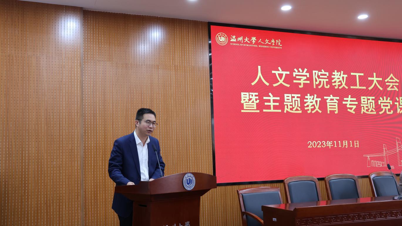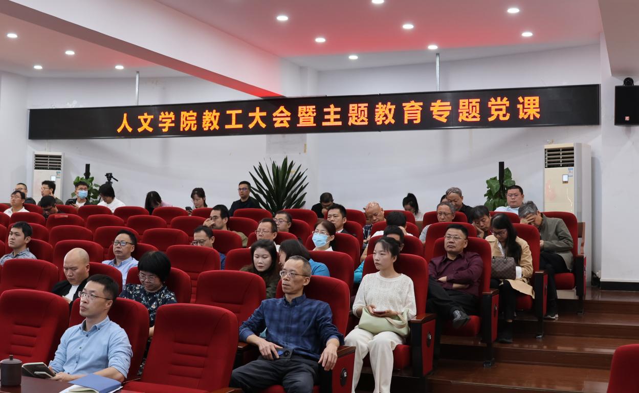 根据学习贯彻习近平新时代中国特色社会主义思想主题教育的工作要求,11月1日下午,免费色情片 在人文楼203会议室举行教工大会暨主题教育专题党课,邀请潘玉驹副校长作《牢牢把握意识形态主导权》专题党课。学院领导班子和全体教职工参加会议,院党委书记江秀景同志主持。