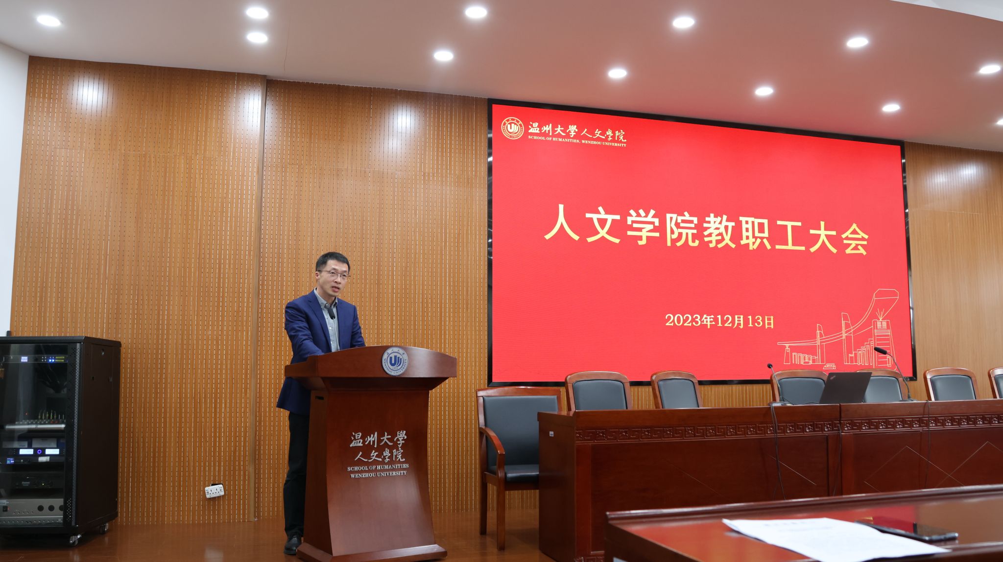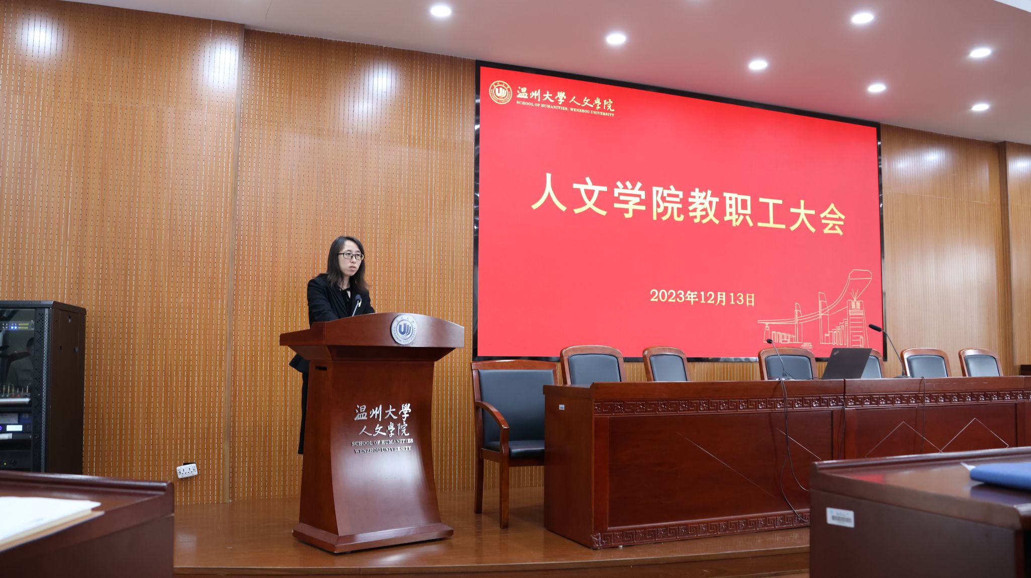 陈源源副院长向全院各位老师通报本学期学科、科研、研究生方面的相关工作以及近期的相关安排,并对中文学科申博工作进行了展望。