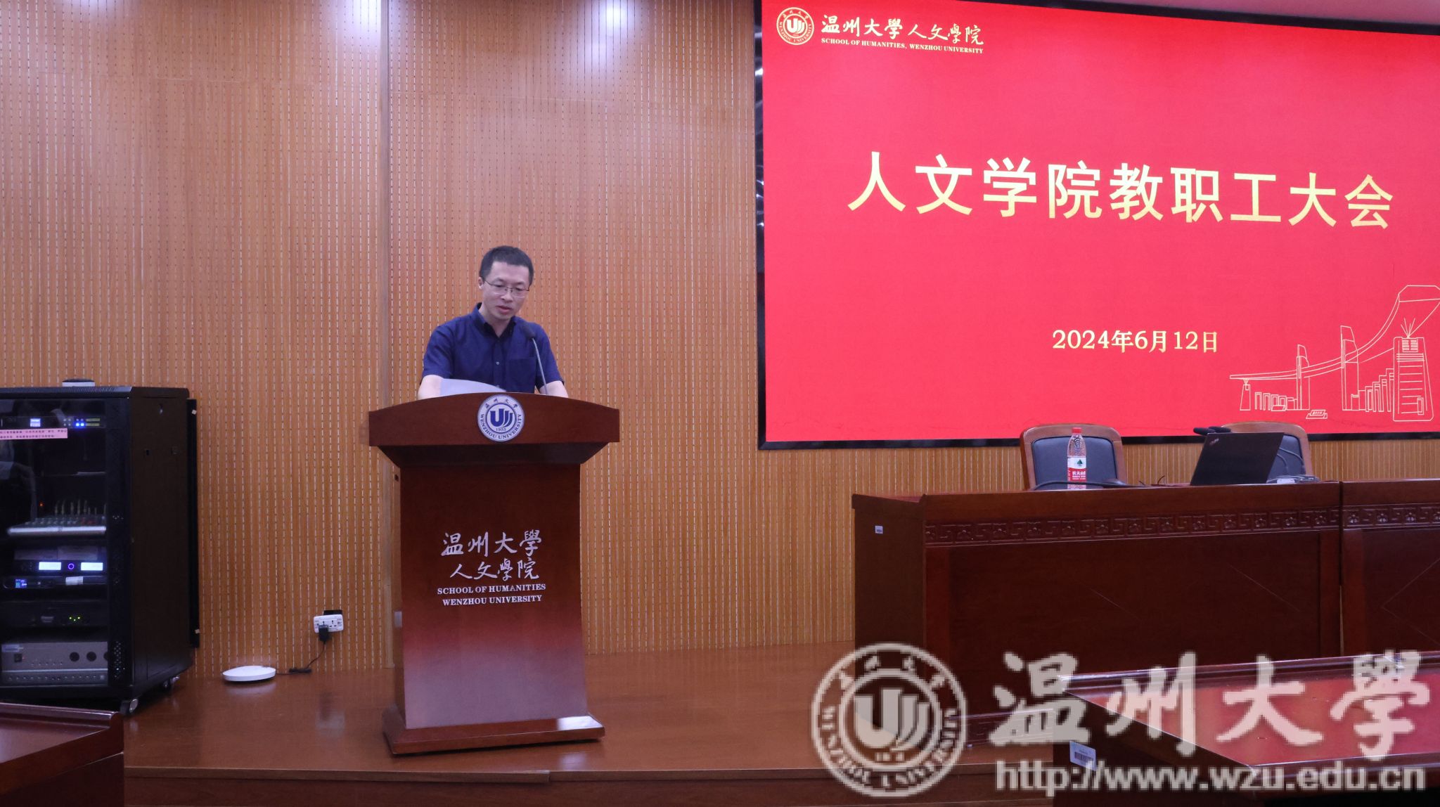 6月12日下午,人文学院全体教职工大会在人文楼203报告厅召开。学院领导班子及全体教职工参加会议,会议由院党委书记江秀景同志主持。