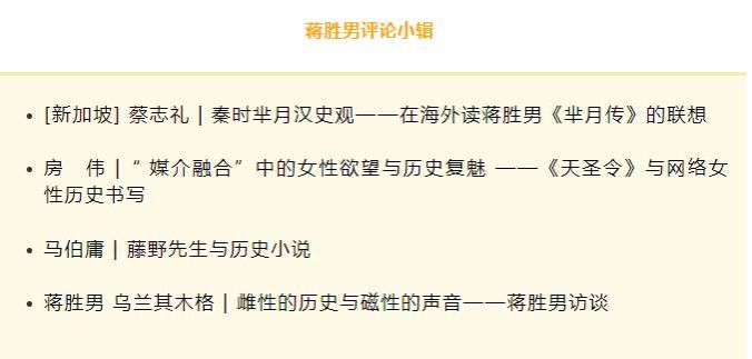 蒋胜男个人作品评论专辑——《蒋胜男评论小辑》。包括《[新加坡] 蔡志礼 | 秦时芈月汉史观——在海外读蒋胜男<芈月传>的联想》《房伟 |“ 媒介融合”中的女性欲望与历史复魅——《天圣令》与网络女性历史书写》《马伯庸 | 藤野先生与历史小说》《乌兰其木格 | 雌性的历史与磁性的声音——蒋胜男访谈》等四篇文章。