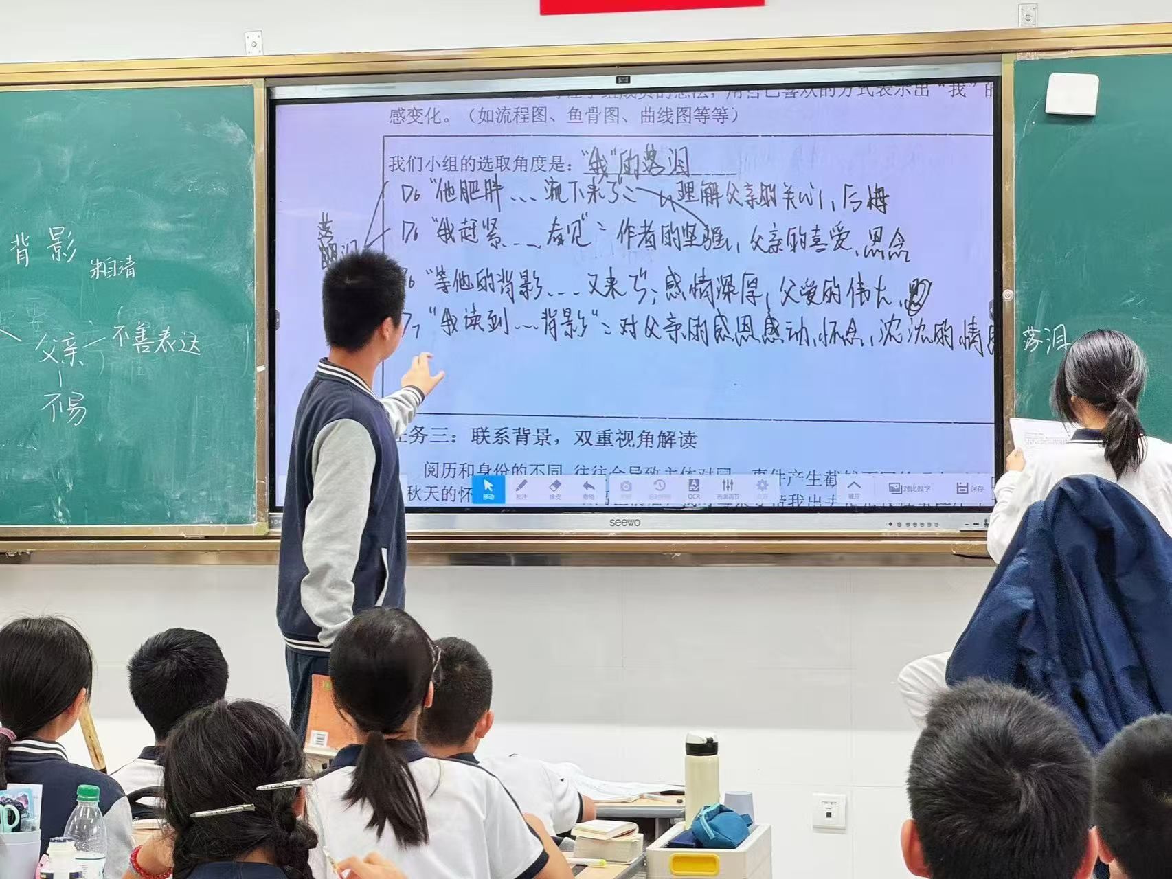 作为实习生代表的方栌悦同学在八年级(5)班教授课文《背影》。本堂课在经历了备课组研讨、集体备课磨课后,呈现出逻辑清晰的教学思路和富有感染力的课堂教学效果。整堂课紧扣“《背影》中的‘双重视角’”,引导学生进行探究式学习。课堂先以学生的预习问题导入,再通过文本细读,带领学生运用赏析式批注的方法分析父亲的形象特点。紧接着,引导学生体悟作者对父亲情感态度的变化,循循善诱,鼓励同学们进行多维度思考与小组讨论。在这一环节,学生积极讨论,课堂气氛活跃,在后面的展示环节提出了不少精彩“新”见。最后,教师逐一进行点评作结。