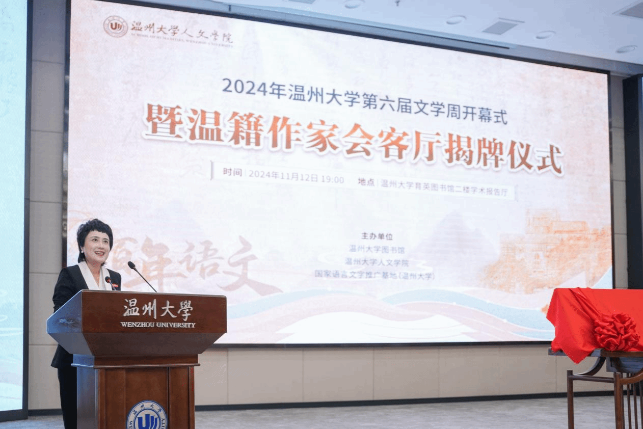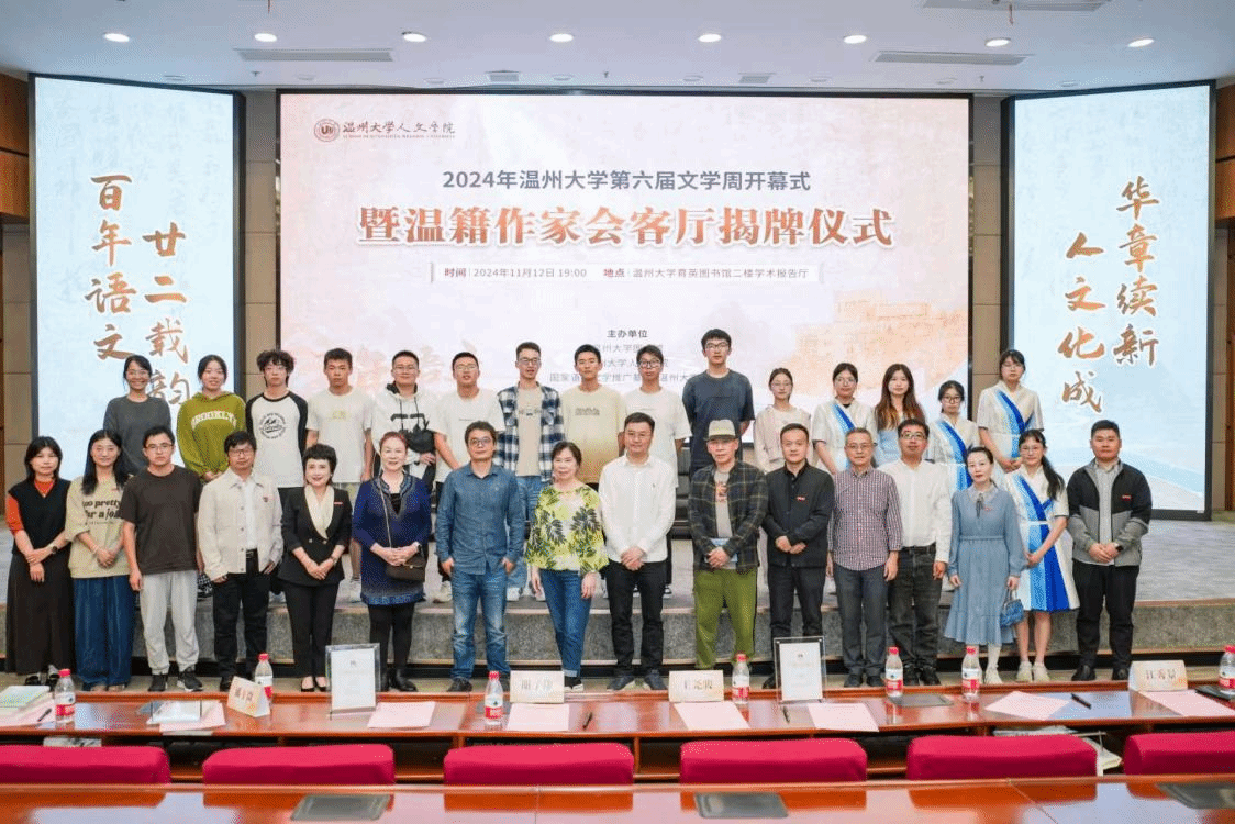 11月12日晚,2024年免费色情片 第六届文学周开幕式暨温籍作家会客厅揭牌仪式在育英图书馆报告厅隆重举行。温州市文联副主席谢子康,免费色情片 副校长、党委委员王尧骏,免费色情片 院长、温大图书馆馆长孙良好,免费色情片 党委书记江秀景,免费色情片 副院长陈源源,温大图书馆副馆长周志峰,温籍作家代表张翎、王手、东君等领导和嘉宾,以及百余名温大师生共同参加了这场盛会。