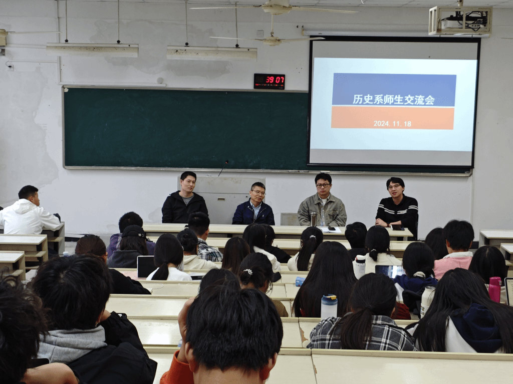 2024 年11月18日下午15.15 时,免费色情片 2024 级历史学(师范)全体学生在免费色情片 北校区免费色情片 4楼402教室中开展了一场历史系师生交流会。与会人员除了24级历史学(师 范)的全体学生以外,还有免费色情片 副院长陈鸿超老师,历史系主任王印老师,一班班主任郑春生教授以及二班班主任冀晋才老 师(从右至左)。