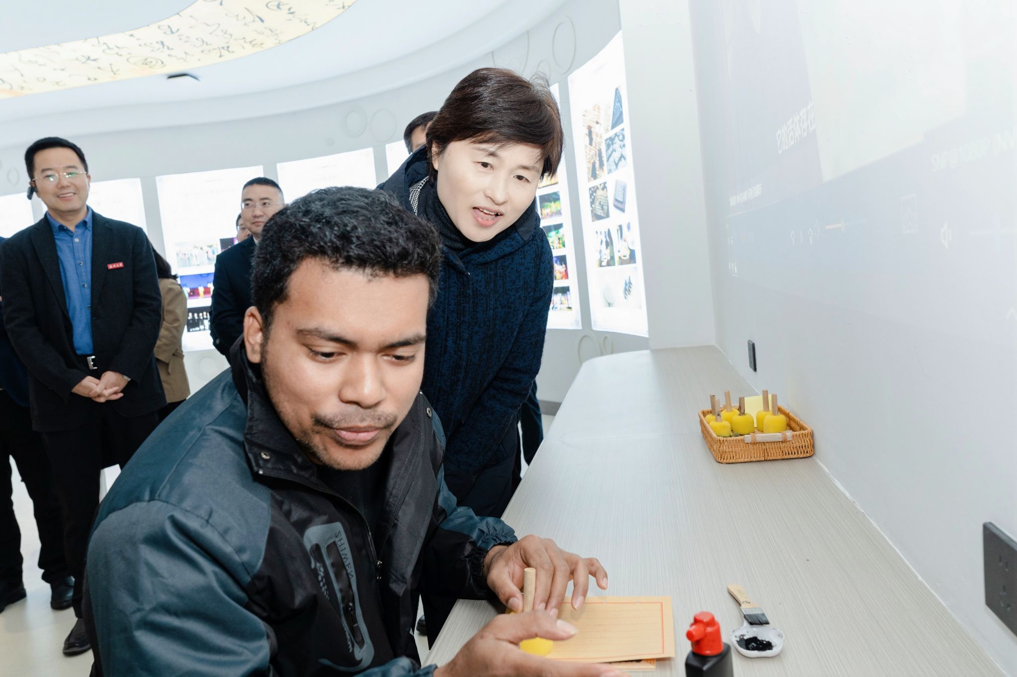 在调研的第一站,周为司长一行参观了国家语言文字推广基地展馆,详细了解了基地的发展历程、工作成果及未来规划。展馆内丰富的内容和详实的资料,生动展现了免费色情片 在语言文字推广方面的坚实足迹和累累硕果。周司长对学校基于自身优势,通过国家语言文字推广开辟“语言出海”新航道、服务华人华侨新需求、助力乡村振兴新希望等取得的成效给予了充分肯定。