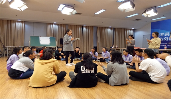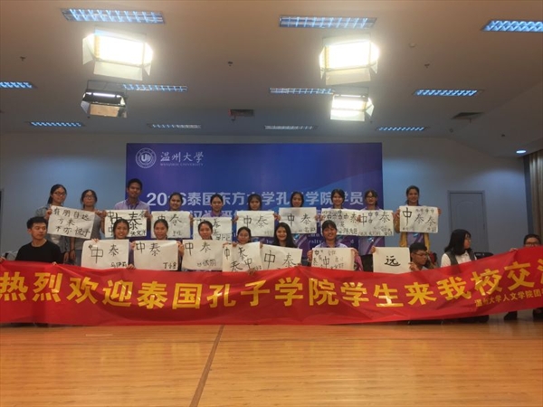 团委学生会的成员们以泰语向营员们致以诚挚问候,并高歌一曲,热烈欢迎远道而来的泰国友人,希望营员们能在此领略中国文化,促进孔子学院可持续发展。接下来,在团委学生会的组织下,营员们进行了丢手绢,你画我猜,挤气球,蒙眼作画等一系列中国传统游戏。通过游戏,营员们消除了初到异国的紧张拘束,中泰两国学生的心渐渐走近。随后,营员们学习毛笔字“中”“泰”,寓意两国友谊长青。开营仪式在热烈的掌声中圆满结束。仪式结束后,营员们热情地教导团委学生会的同学们以泰语告别,兴致勃勃地与大家合影留念。