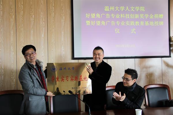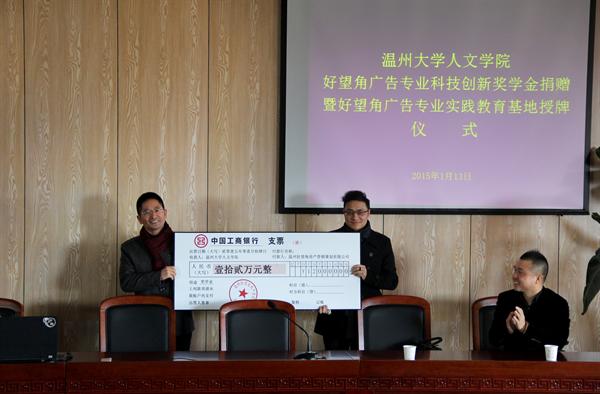 广告学专业捐赠人民币12万元,设立好望角广告专业科技创新奖学金,奖励在科技创新、学科竞赛以及学术创新等活动中表现突出的广告专业本科学生。该奖学金在每年上半年评审一次,每年设6个奖励名额,每人奖励5000元。学院将在温州好望角房产营销策划有限公司建设“广告专业实践教育基地”,双方将在广告学专业实践人才培养的模式改革、课程开放、特色教材建设、基地教学与管理、师资队伍建设等方面进行深度合作。