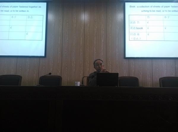 学术报告厅作了题为“词义和概念化、词化”的讲座。本次讲座由马贝加教授主持,汉语言教研室、外国语学院的老师、语言学专业研究生及本科生参加。同学们对本次讲座满怀期待、热情高涨,即使座位不够也不愿离场,有的坐在台阶上,有的直接站着,大家都静静地等候蒋先生的到来。