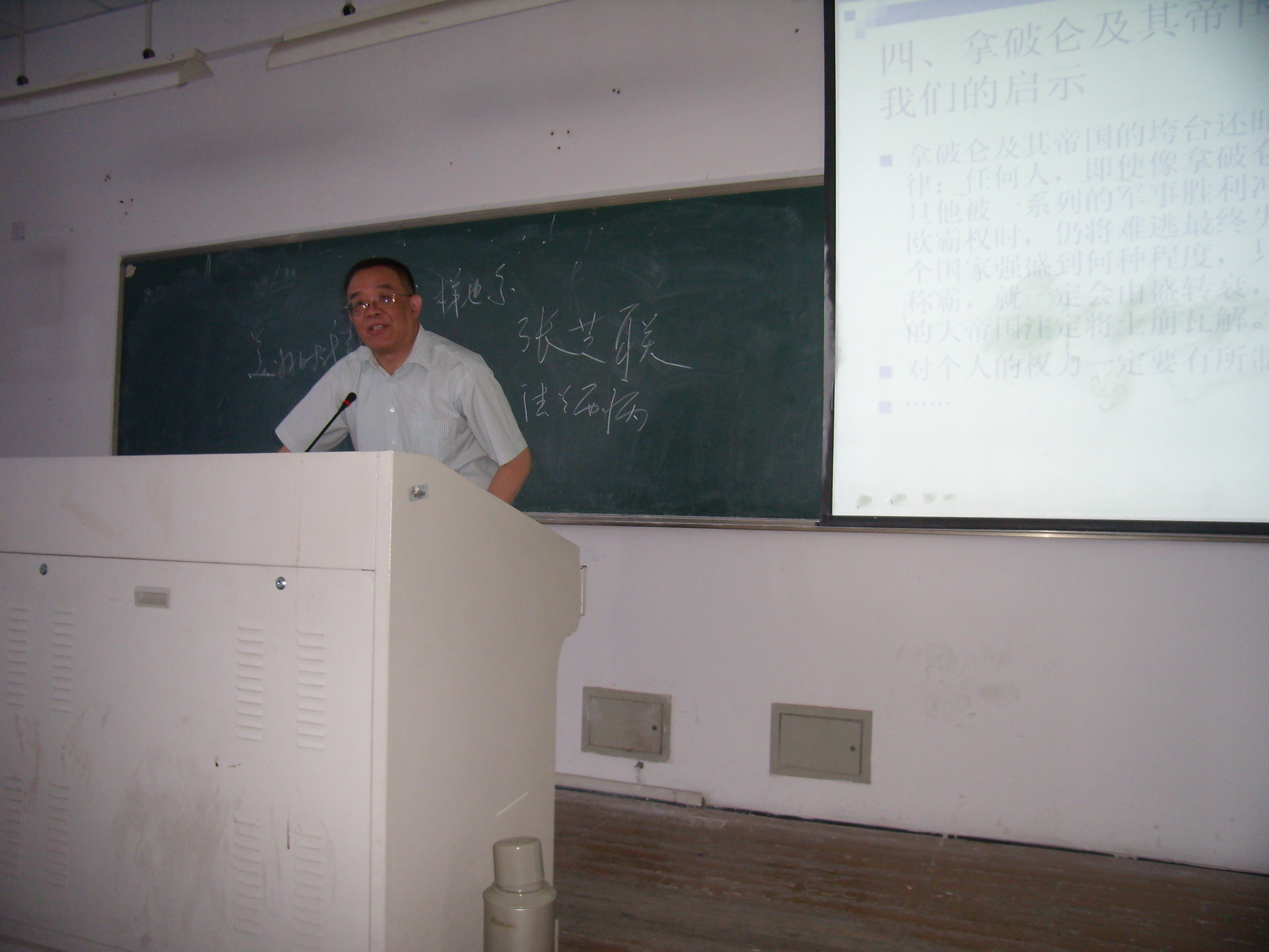 副院长、历史系博士生导师吕一民教授的讲座《拿破仑的崛起与法兰西第一帝国的兴衰漫谈》。吕教授在法国史研究方面有很高的造诣,曾出版过《大国通史-法国通史》、《一九一八--一九三九年的法国》、《世界著名首相传》、《世界著名记者传》、《法兰西的兴衰》、《20世纪法国知识分子的历程》等专著。此外还翻译了《知识分子的鸦片》、《卡尔•波普》、《自由之声--19世纪法国公共知识界大观》、《公民的加冕礼:法国普选史 》、《海德格尔》、《耶稣会士中国书简集:中国回忆录》等书籍。郑春生、蔡瑞霞、陈勇等老师也聆听了讲座。