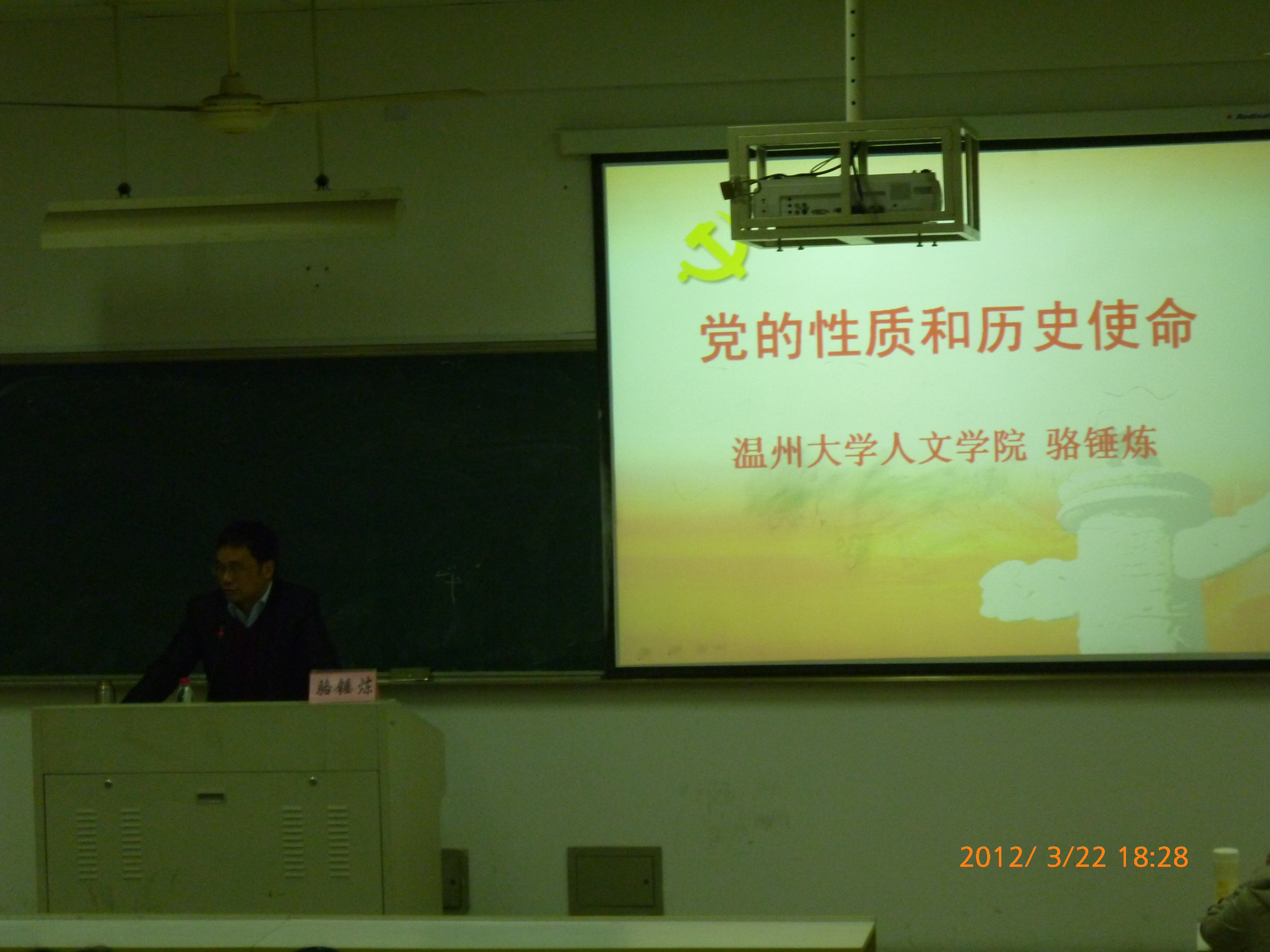 2012年3月22日晚18时30分,免费色情片 第十五期党校培训第二课在1-301开课。免费色情片 党总支副书记骆锤炼老师作为主讲人出席了本次党课。77名党校的学员和党员之家工作人员积极主动地前来聆听讲座。