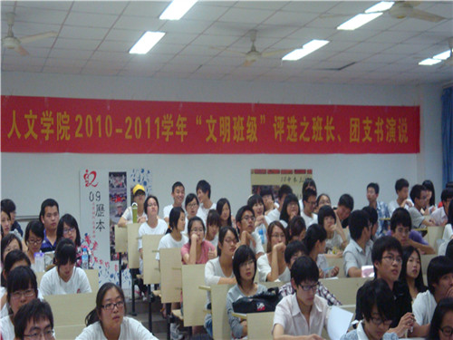 本次的演说,第一项活动便是由各班的班长团支书上台进行班级风采展示,由3位评委老师和学风建设委员会进行打分以及现场同学进行投票;其间还穿插两个抽奖环节,最后就是现场投票。首先,第一个上台进行展示的便是09中本1班,他们向现场的来宾展示了极高的班级素质和凝聚力。接着,按照实现的抽签顺序,10中本2班、09历本、10中本3、10中本1依次上台进行演说。期间高潮迭起,精彩连连。穿插其中的抽奖环节更是让现场的气氛达到了最高潮。最后,在各个班级都展示完后,各个评委和同学们也就在选票上写下自己心仪的班级,一次投入投票箱中,而本次活动也就这样圆满结束了。