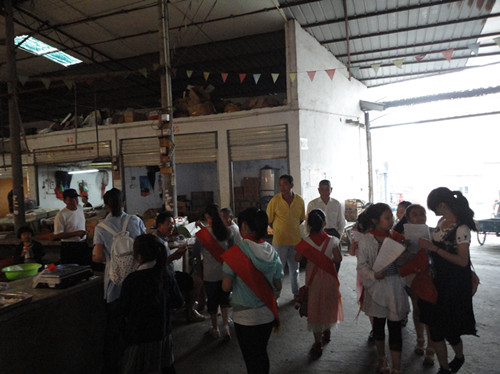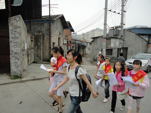 早上8点30分,小朋友们兴高采烈的聚集在操场上,经过两个学期的兴趣班学习,小朋友都变得更加有组织有纪律。活动前,志愿者就本次夏日健康安全宣传活动的相关细则和注意事项向小朋友进行了详细说明。稍后丽岙一小的吴老师又对活动提出了一些指导性意见和建议,强调了安全第一的原则。一切妥当之后,小朋友和志愿者以"4小一大"的组合分成若干小分队后开始了宣传活动。小朋友们拿着宣传单穿过农贸市场和商城,面带微笑向过往的人们分发传单,宣传夏日健康安全小知识。最终,小朋友们都圆满地完成了任务,看着丽岙镇居民们认真阅读着手中的单子,志愿者和小朋友都开心地笑了。活动后,丽岙一小的吴老师告诉志愿者们:"之前的服务活动大多都是集中在教室里,小朋友学到的大多是课本知识。这次社会实践课程,让这些留守儿童走出教室,以志愿者的身份跟社会接触,以一个小大人的姿态跟社会大众交流,让他们锻炼了自身的能力并且获得了满足感。这是难能可贵的,留守儿童缺乏的正是精神层面的成长。"