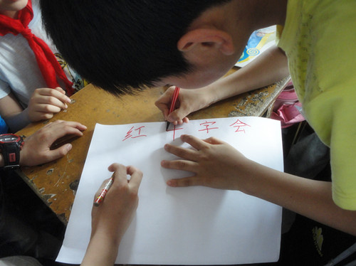 中午12点30分,志愿者们一同前往益民小学,在学校老师和负责人的协助下,志愿者们确定了五(3)班为活动对象。这次活动的主要内容是,小朋友们根据"红十字"的主题,共同合作制作海和手抄报。活动开始后,志愿者们首先对班级51位同学进行了分组,然后分发画纸。各个志愿者辅导6~7位小朋友。由于考虑到小学生对红十字会没有太多了解,志愿者负责人事先搜集了相关资料,分发给小朋友们参考。在活动过程中,所有小朋友都积极参与,拿出画笔,共同商讨绘画。志愿者们也为其提供不少帮助。在将近一个小时的活动中,志愿者们和小朋友们建立了良好的关系,绘出了能表达自己心声的图画。