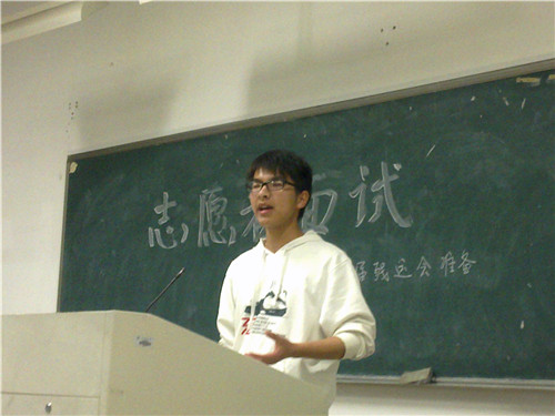 共有十名志愿者参加本次的面试活动。每个志愿者都摩拳擦掌,愤愤预试将自己最美好、最完美、最神圣的一面展示给评委们。无不显示着他们对志愿者服务的热情和喜爱。试招聘活动于18时30分准时开始。志愿者们上台进行了各具特色的自我介绍,别具风味的展示着各自的优势和优点。之后,志愿者再灵活而又从容地应答着人文思源青年志愿者协会会长等"面试官"的各类"犀利"问题,体现了各自的冷静应变能力。在经过艰辛而又紧张的面试之后,十名志愿者完成了"剑拔弩张"的面试"战争"。