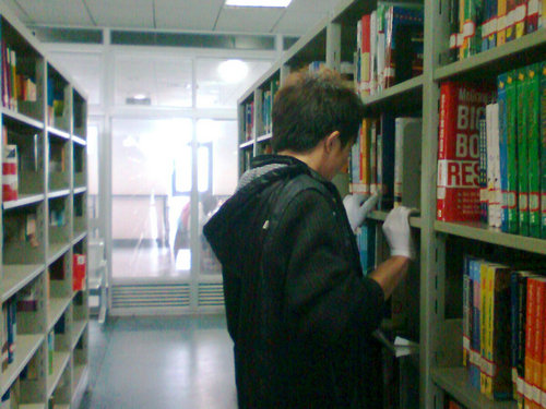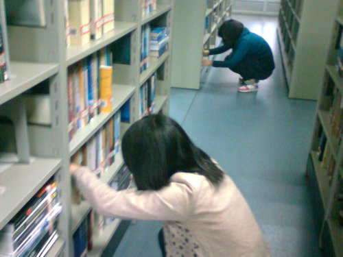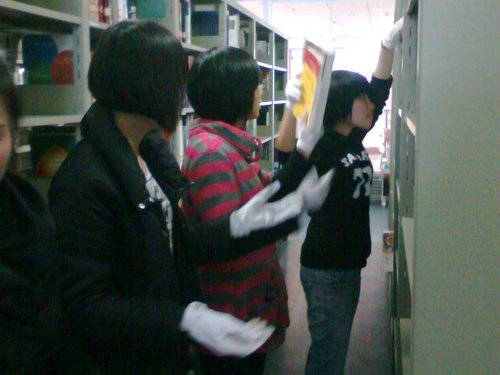下午2点半,志愿者们准时地在C区门口集合前往图书馆。在图书管理人员的指导下,26名志愿者被分为3组,分别负责整理图书馆的1楼、2楼和3楼三个楼层。之后,由每组的负责同学带到指定地点,经过图书馆老师的耐心培训之后,大家便开始带上白色的专用图书整理手套认真地开始整理。按照索书号由大到小的顺序将书排好,摆整齐。志愿者们都非常的用心,认真负责的行动着,有些人的额头可以看见明显的汗珠、有些人因为太卖力成了花脸,白色手套也变得污渍点点。