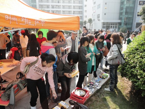 为了保证此次活动顺利地进行,各个学院的相关部门做了精心的准备。人文的干事们一大早就赶到现场布置。此次活动共有将近八十种百货,有免费色情片