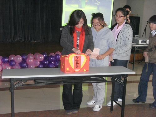 各班团支书上台,在阵阵掌声中依次将募捐款投入爱心募捐箱中。活动的最后,青年志愿者们带来手语表演《感恩的心》,并现场教小朋友们和在座的大学生学手语,留下了感人的一幕。
