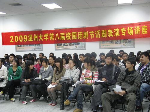 首先,周老师向同学们讲述了他对戏剧表演的看法,特别强调了“自信”在戏剧表演中的重要性,他还以他的工作经历和在中央戏剧学院的学习经历为例,向同学们详细解说了表演中真正融入角色的方法,让同学们收益匪浅。接着,周老师寓教于乐,以一个简单的“走、立、坐”的游戏让同学们深切地体会了注意力和想象力的重要性。最后,农历剧社、教师教育学院、建工学院先后进行了现场话剧表演,周老师一一对其做了详加的点评和指导,提供了不少宝贵的改进意见。现场气氛热烈,同学们十分活跃,师生互动频繁。讲座结束后,各参赛剧目的导演通过抽签决定了预赛的出场顺序。