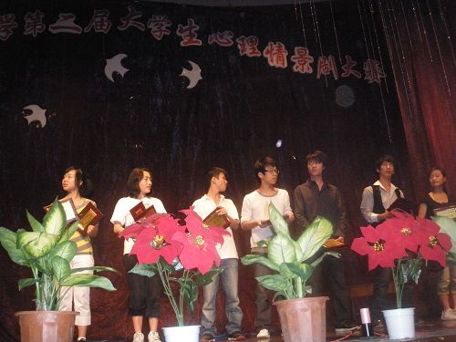 第二届心理情景剧大赛”在南校音乐厅拉开帷幕。参加此次大赛的有来自各学院的18支代表队。校心理健康中心主任张海音老师、心理咨询师王晓程老师、杨德省老师等5位老师应邀出席了本次大赛并担任评委。