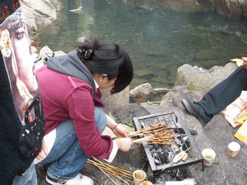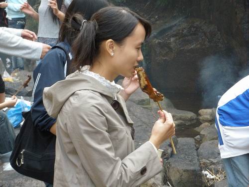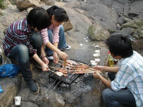 上午10点,四小组成员在各位小组长的带领下先后到达烧烤地点。各组长领取烧烤材料之后,就开始生火烧烤。你放肉,我涂油、他加调味品,每位同学都积极加入到活动中,一展自己的烧烤技术。在大罗山的怀抱中,同学们一边感受着美丽的大罗山所带来的宁静,一边享受着自己的劳动果实。在繁忙的学习生活之余可以欣赏如此的美景,不得不使同学们的心灵得到了极大的放松。
