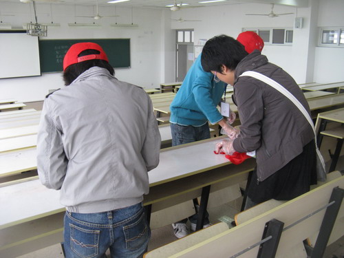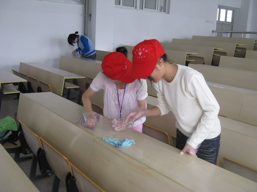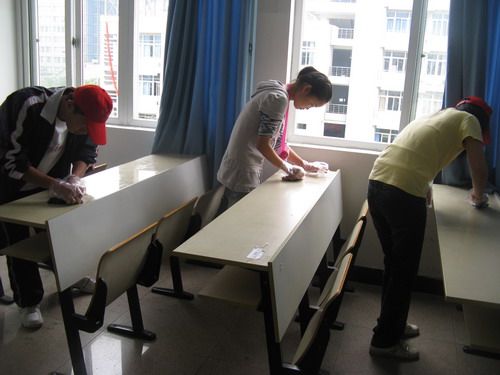 教学楼所有课桌上的污垢进行了全面的清洗。全体参加人员始终以"还课桌一张美丽的面容,还教室一份温馨的宁静"为目标,辛勤劳作,刺鼻的清洁剂、顽固的污渍丝毫没有影响同学们工作的积极性。虽然有的痕迹一时难以清除,但大家都耐心地擦拭着,生怕漏掉了一个小斑点。