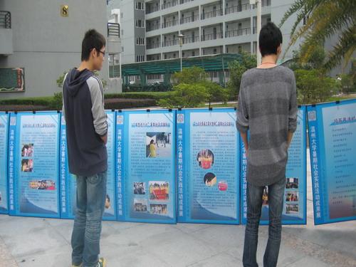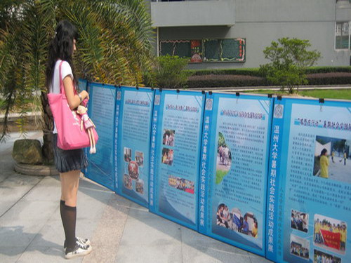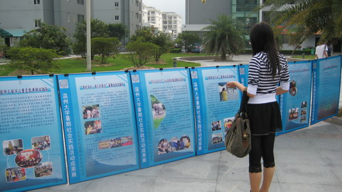 市级优秀队伍、校级优秀队伍以及院级优秀队伍的暑期社会实践成果。展示内容包括各实践队简介、详细活动情况以及实践集体、个人所获荣誉等。本次实践展内容丰富、图文并茂,吸引了不同学院同学驻足观看,可以说,成果展收到了相当不错的效果,达到了预期的目的。
