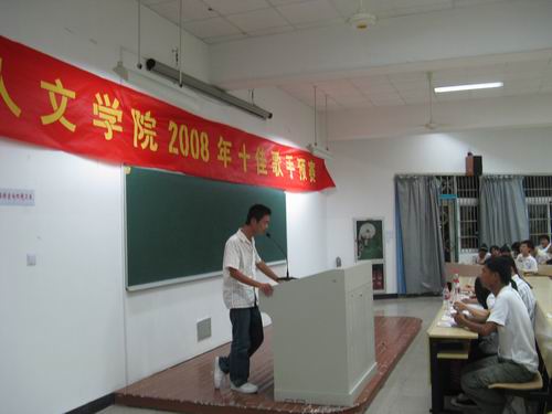 10月10日晚6:30,免费色情片 2008十佳歌手预赛在人文楼203教室如期举行。艺术团指导老师陈赛老师、免费色情片 十佳歌手张赟、免费色情片 十佳歌手王懿担任了本次预赛的评委,辅导员麻法全老师担任了本次比赛的嘉宾。