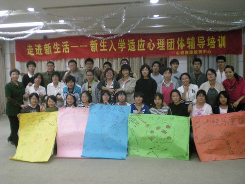在活动中开展了一系列以游戏为方式的促进团体融洽和谐的活动。首先围圈面对面介绍自己,通过轮番的介绍达到互相认识彼此认识整个集体的目的;而后随着辅导员老师报数大小来组建各自的小家庭,而落单的同学就只有倾诉此中的落寞与孤寂。由此引出新生初到大学的思家之情。在思家的前提下,循序渐进,又各自分组成立五个大家庭。通过画海报,取家之名,立口号介绍家庭,代表发表大学学习爱情、友情方面感想一系列建家的过程让彼此更为了解,熟识;最后大家以手语共同演绎了一首《我们都是一家人》来结束这场温馨的家庭大聚会。