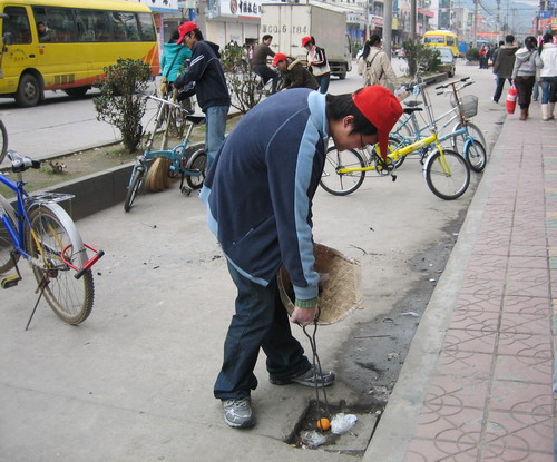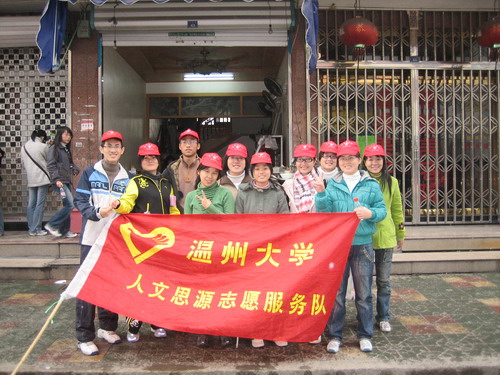 青年志愿者们积极响应校青年志愿者中心的号召,开始了他们打扫茶山街道的活动。