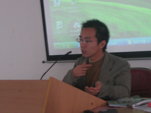 志愿者服务中心的主任丁一民同学与同学们进行了有关06年温大西部社会实践活动的交流。