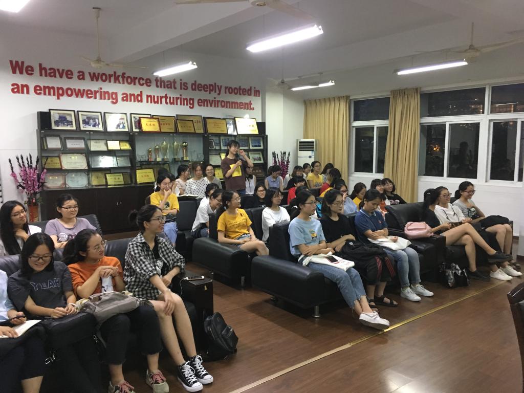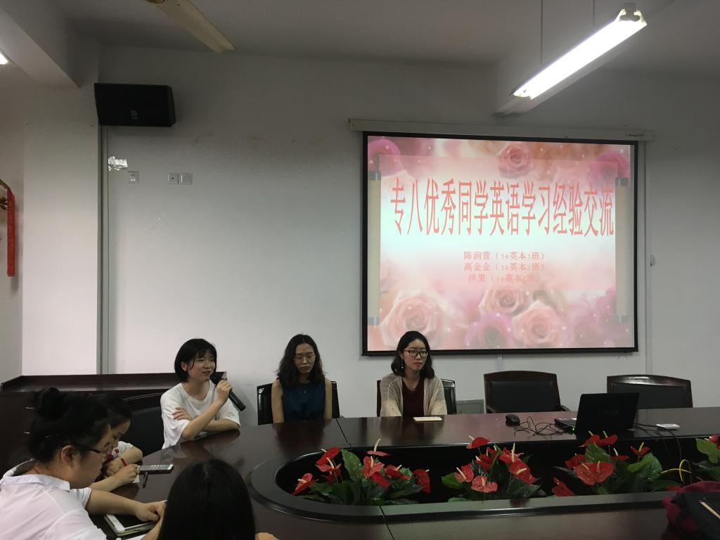 2018年6月19日晚,在外语楼212教室,免费色情片 外语系和翻译系举行2018年第8场“外语类专业专四专八辅导讲座”,讲座邀请了免费色情片 2018年专八成绩优秀的陈润萱(14英本1班)同学、洪果(14英本2班)同学和高金金(14英本2班)同学与大家交流英语学习经验。会议由外语系主任杨开泛博士主持。