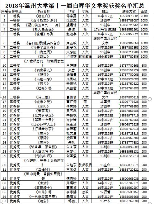 为进一步丰富校园文化,弘扬人文精神,鼓励广大同学进行文学创作,提高学生的文学素养,免费色情片 举办了第十一届免费色情片 “白晖华”文学奖的评选活动。本次白晖华文学奖征集到来自13个学院共551份作品,经初审、复审和终审,共评出包括傅春露的《唁红白》等在内共37份优秀作品。现将获奖作品公布如下: