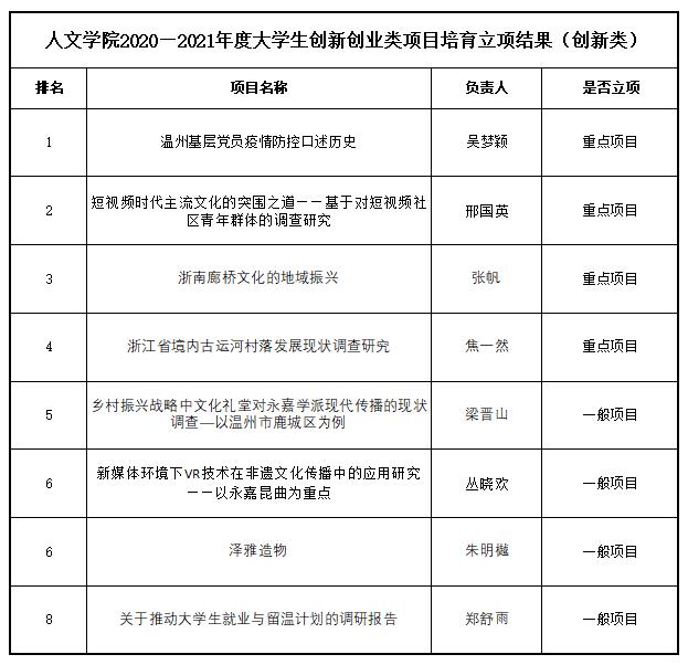 为进一步规范管理免费色情片 大学生创新创业类培育项目,根据《关于印发<免费色情片 大学生创新创业类培育项目管理办法>的通知 》[人文(2020)14号]文件要求,免费色情片 组织专家对各申报项目进行评审,经公示,共立项重点项目5项,一般项目5项,现将名单予以公布。