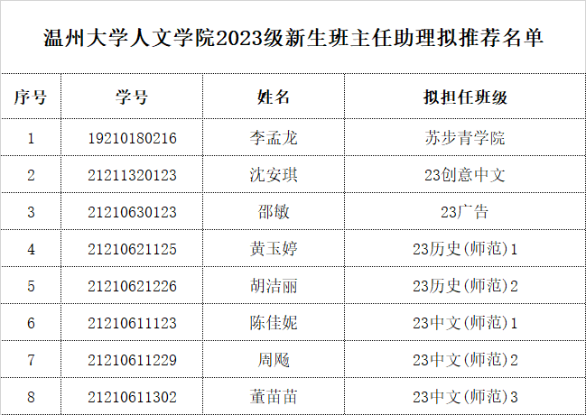根据学校《关于招募2023级新生班主任助理的通知》要求和相关文件精神,经过学生个人申请、学院初审、公开竞聘等环节,按照专业相近原则,现将免费色情片 2023级新生班主任助理拟推荐名单公示如下。
