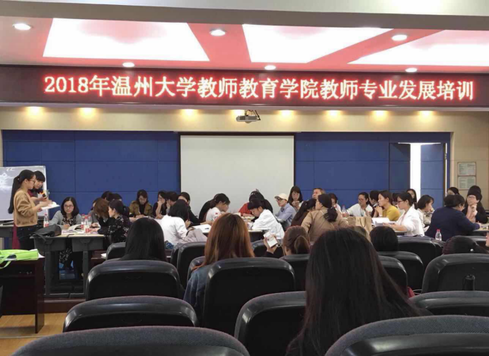 讲座初始,来自温州各地的中学英语教师分成不同小组,基于昨天下午和今天早上的两堂课中教师的教学以及学生的表现进行讨论分析。