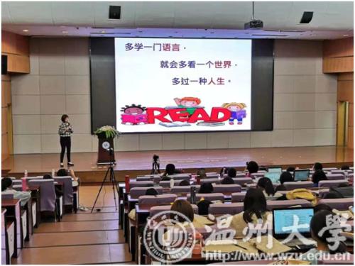 讲座以张湘君老师对儿童英文绘本以及其本人带领的作家团队的介绍为开端。强调孩子在上学前输入口语语音,打开孩子的耳朵,将声音跟世界联系起来的是极其必要的。接下来介绍图书,张老师表示即使是高年级学生也需要绘本,需要童真与温情。在讲座的第二阶段,张老师又分析了从小学到高中的变革趋向,讲述了英文绘本与儿歌在英文启蒙方面的重要作用。在与大家互动的过程中,张老师以李开复为例,告诉同学们创新力与跨越文化的国际力是优秀的孩子所必备的。进而带领大家观看视频案例,加深了同学们对英文绘本的理解。由此可知,绘本给予孩子们学习英语的三大帮助:能够提供自然的语言情境;能让孩子们减少压力;能使孩子轻松愉快的接受英语教育。