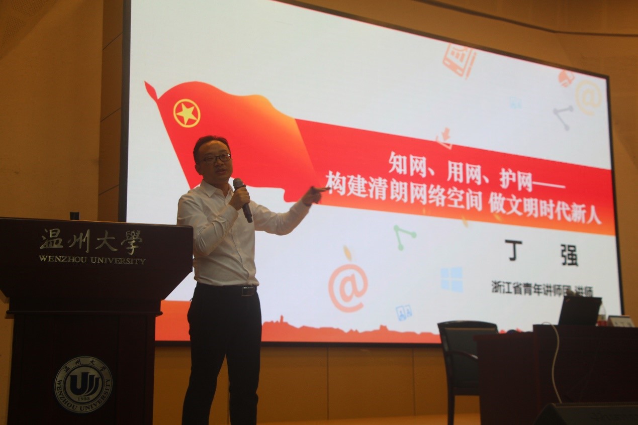 “知网、用网、护网——构建清朗网络空间,做文明时代新人”是丁强老师本次讲座的主题,他向同学们介绍了何为网络,网络的发展以及网络社会的发展。其中,狂欢、交互和融合是网络时代的特征,当然,网络时代也给我们带来了看客心理、被看心理、群体极化、从众心理等一系列的问题。