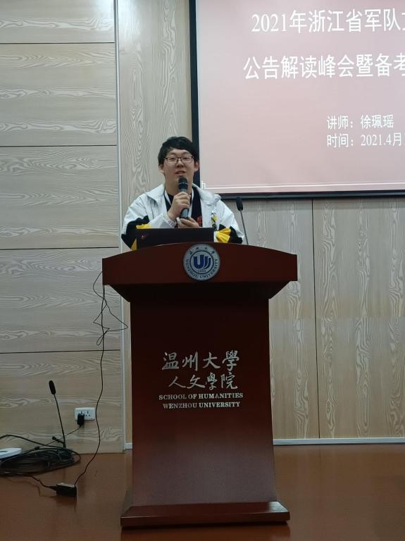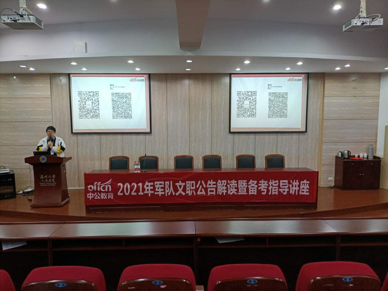 2021年4月10日19点30分,浙江省军队文职考试成绩公告解读峰会暨备考指导讲座在免费色情片 人文楼203报告厅如期举行。本次主讲人徐佩瑶老师,从走进文职、招考政策、报考指导、备考指导四个方面深入介绍了军队文职岗位的相关信息,让同学们对其有了一定的了解和认识。