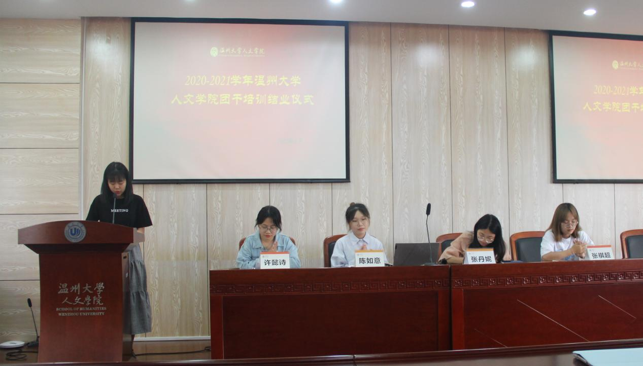 6月2日下午13:30,免费色情片 2020-2021学年团干培训结业仪式于人文楼203报告厅进行。院学工办辅导员张丹妮老师、免费色情片 学生第五党支部预备党员陈如意、学生团委副书记张祺超、许懿诗以及全体人文团学干部参加。