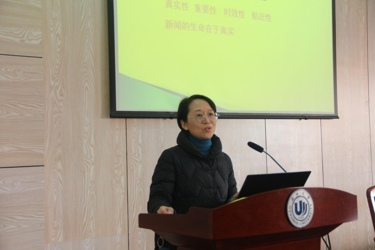 “新闻的生命在于真实,新闻写作就是戴着镣铐跳舞,有很多规范性的约束,不能随心所欲”,在着重强调写作态度和真实性后,金老师用她二十年来写作的经历告诫我们,写文字必须严谨,因为白纸黑字,一旦发出,无可挽回。同时,金老师表示:做新闻,写推文,大家一定要打起十二分的精神。