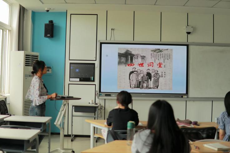 刘飞燕同学带来的经典书籍是老舍的《四世同堂》。《四世同堂》以祁家四世同堂的生活为主线,辅以北平小羊圈胡同各色人等的荣辱浮沉、生死存亡,真实地记述了北平沦陷后的畸形世态,史诗地展现了第二次世界大战期间,中国人与世界人民一道反法西斯的伟大历程及生活画卷。她指出,该书对人物的形象刻画可谓是入木三分,《四世同堂》的描写对象涉及的主要家庭有七八个,主要人物有几十个,几乎囊括了当时社会各个阶层的等各类形象,但作者都处理得非常得当。可见该书的艺术成就之高,创作手法之妙。
