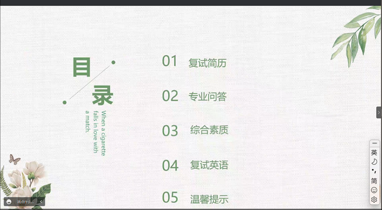 陈蒙蒙学姐重点阐述了复试简历以及专业问答方面的问题。她指出在简历中要突出自己的优势,例如实习、支教等经验,帮助获得面试老师的青睐。在专业问答方面,陈蒙蒙学姐着重强调了语文课标和语文书的重要性。回到原典,可能会成为能否成功上岸的重要因素。