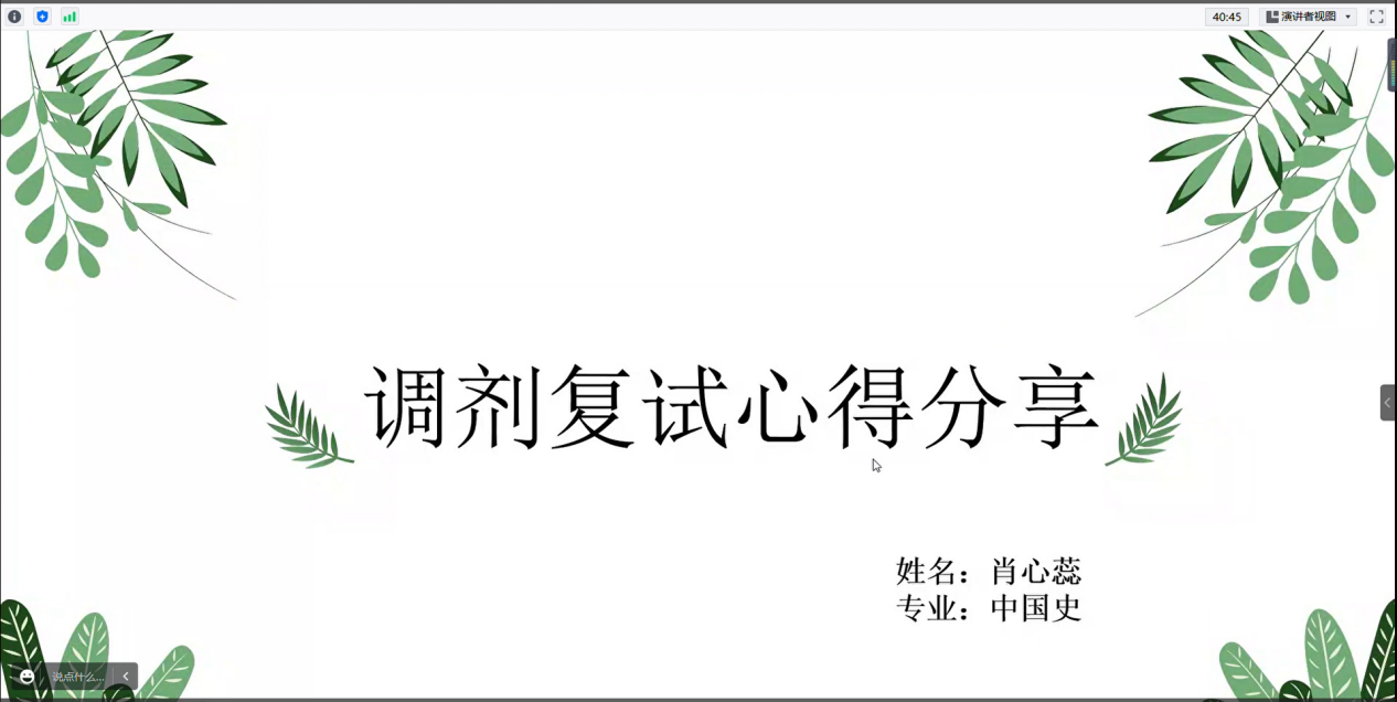 李蓓学姐从复试前的调研、复试准备以及自身的复试流程方面给予建议。她建议同学们无论复试成绩如何,都要保持平稳的复试心态。自己掌握主动权,才能不浪费时间。其次,模拟面试也是非常重要的,模拟面试不仅可以检验自己的复习成果,还可以舒缓自己在正式面试时的紧张情绪。最后,她建议无论在面试中遇到怎样的情况,都应该保持一种从容的状态。
