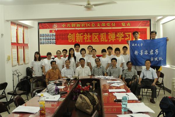 2013年7月10号,粉墨亦君子实践队出征!我们一起住到了瓯北创新社区居委会,跟随永嘉乱弹第七代传人、乱弹传习所所长麻福地老师开始了长达十几天的学戏之旅。我们的活动总体上分4个阶段——南戏学习、南戏宣传、南戏调研、日常保护。7月10日至19日是南戏学习阶段,我们跟随永嘉乱弹(南戏遗音之一)第七代传人现年71岁的麻福地老先生及其他几位伴奏老师在瓯北创新社区居委会学习乱弹。