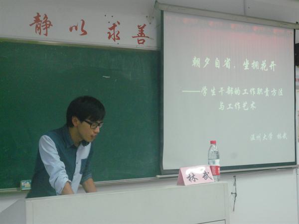 的前团副在团学工作上有极其丰富的经验,他从学生干部的工作职责方法与工作艺术两个方面进行详细讲述。他首先对学生干部这个身份进行剖析,他认为学生干部并不是一个管理者,而应该是一个服务者,接着再是思想引领者。他认为,作为学生干部要培养一专多能:一专——学习好专业知识,多能——处理信息的能力、处理人际关系的能力、系统看待问题的能力以及运用技术的能力。他为各位学生干部定出了一系列目标:组织一系列活动,准备一次主题报告,申报一项学生课题,读100本书,用好100个周末,和不同的同学进行100次谈话,思考100个问题。其次,要练就好的性格,避免性格悲剧,还要训练自己的思维。最后,要重视自己的团队,不要轻易离开自己的团队;要心怀感恩之心,感谢团队给你的平台,不抛弃,不放弃。