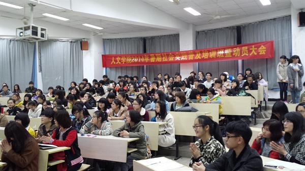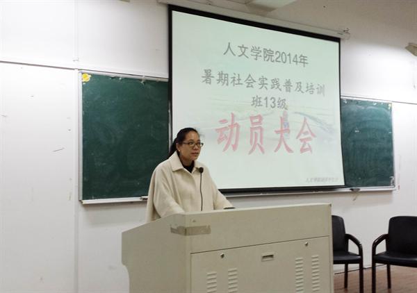 暑期社会实践普及培训班暨动员大会在北校人文楼101教室召开,学生科科长曾蓓蕾老师、人文团学主席团以及学院13级大一各专业同学共同参与本次大会。
