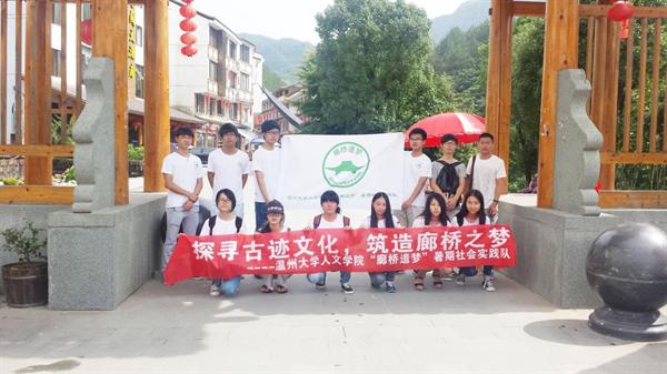 我们“廊桥遗梦”暑期社会实践队以温州泰顺廊桥作为研究对象,主要研究泰顺廊桥的民俗文化以及其保护与发展现状。其中,民俗文化为研究重点,我们将围绕民俗活动以及建造廊桥的手工艺进行探索,开展现场观摩廊桥制作、体验民俗活动、开展廊桥文化展等活动。我们的实践队的策划获得了校策划大赛三等奖,有了良好的开始。我们希望在这个许多传统文化遗产被冷落、破坏的时代,将泰顺廊桥这份凝聚人类智慧的杰作介绍给更多的人。